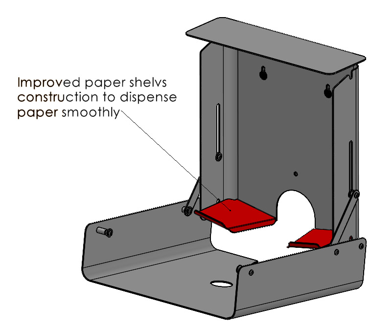 - Amélioration de la géométrie des deux plateaux inférieurs pour un glissement plus fluide du papier, que le distributeur soit plein ou presque vide.