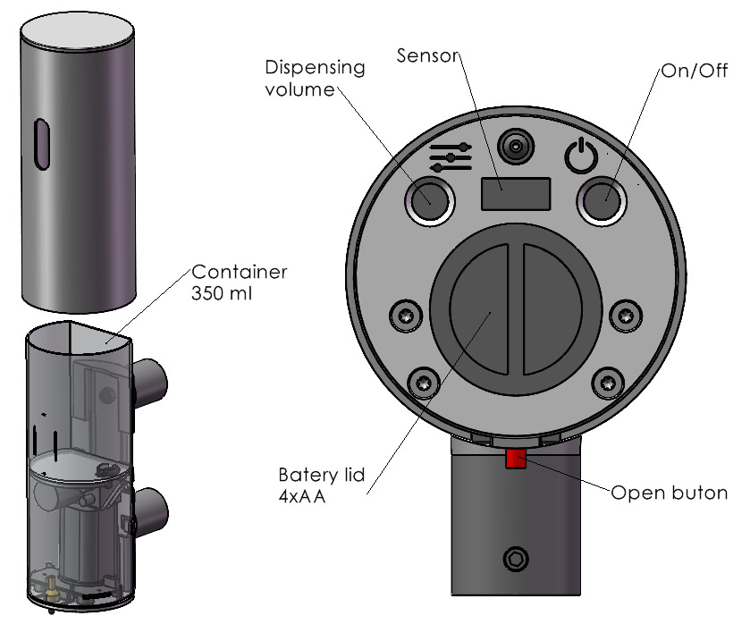 - Indication du liquide via fenêtre ovale (autocollant – savon, lotion et désinfectant).